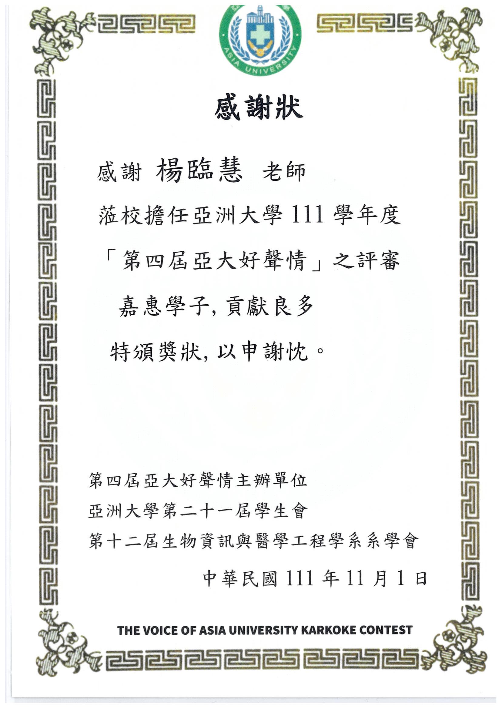 亞洲大學第四屆亞大好聲情校園歌唱比賽評審